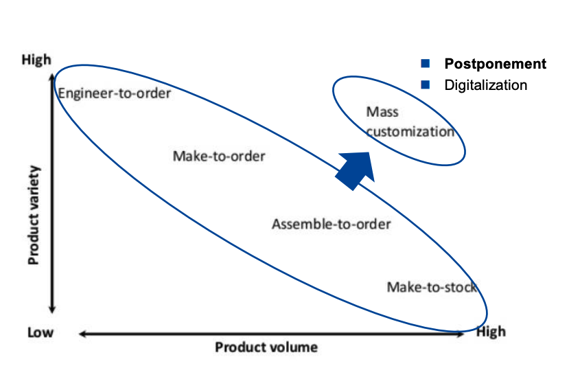 - inventory reduction by risk pooling (instead of stocking different variants, a unique base-variant is stored and then differentiated after the order).